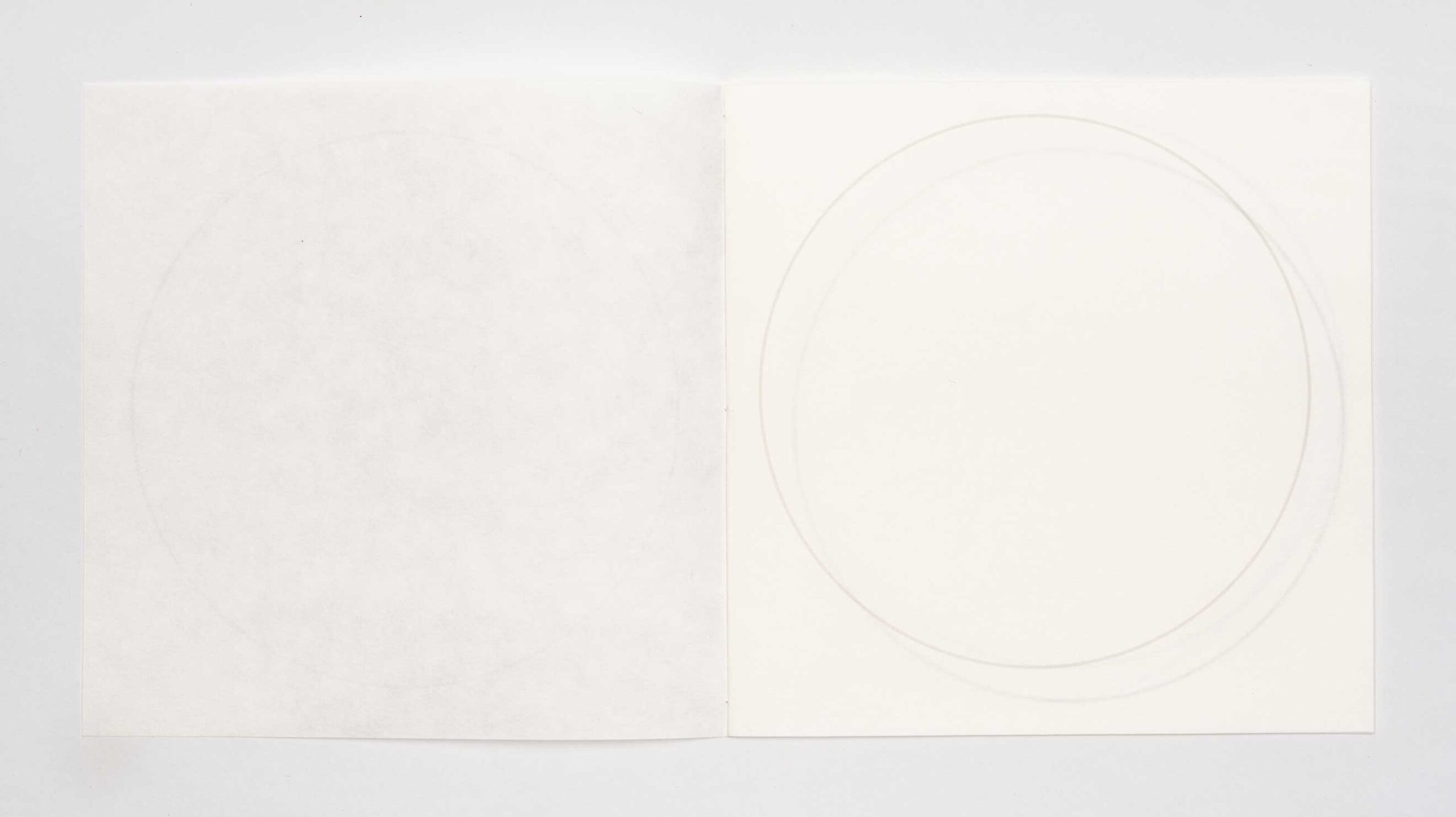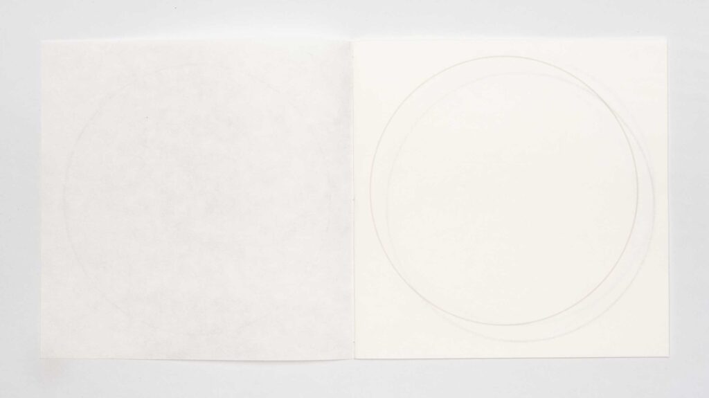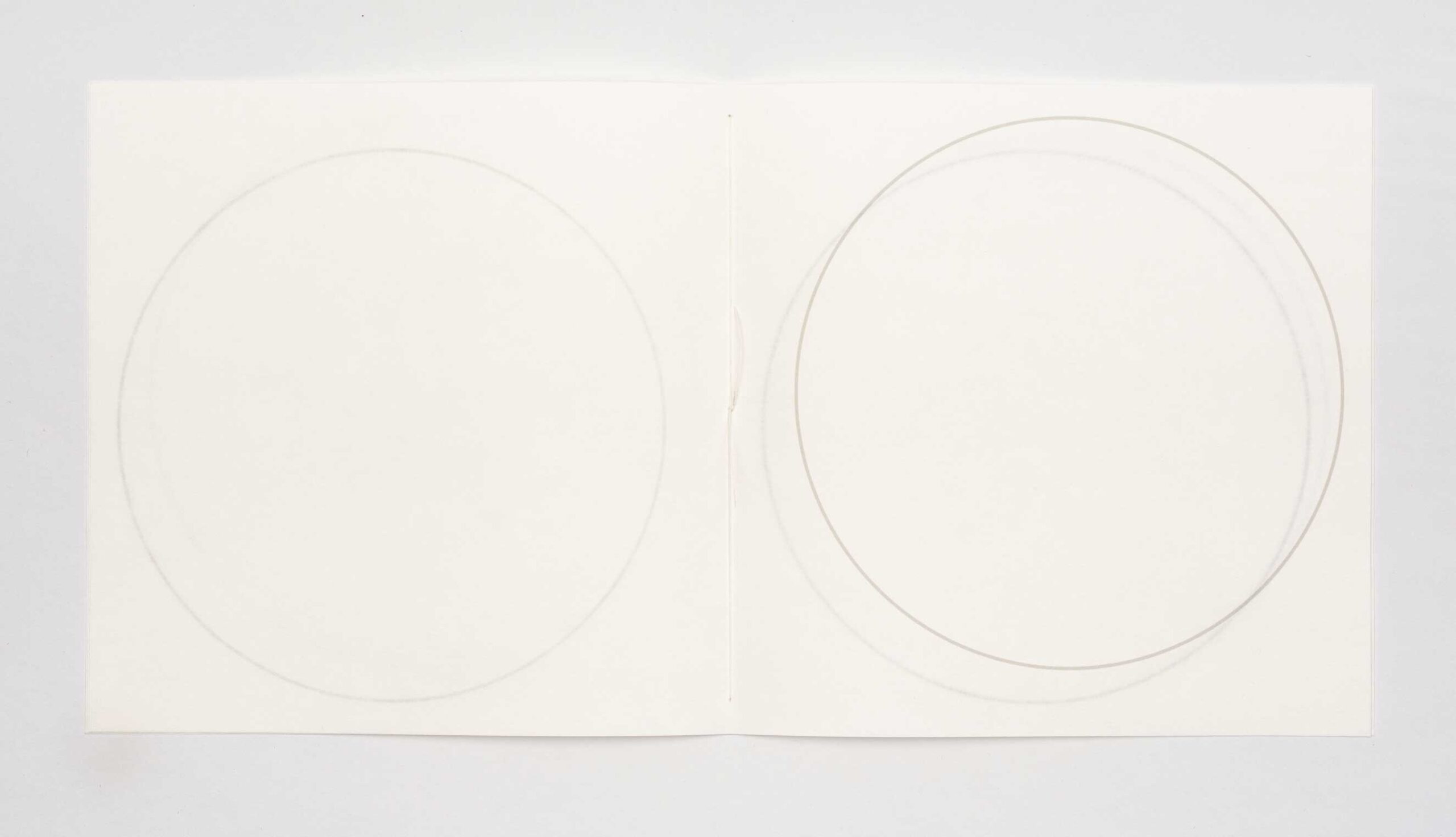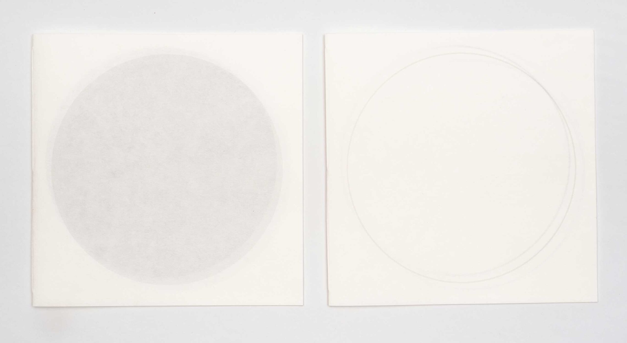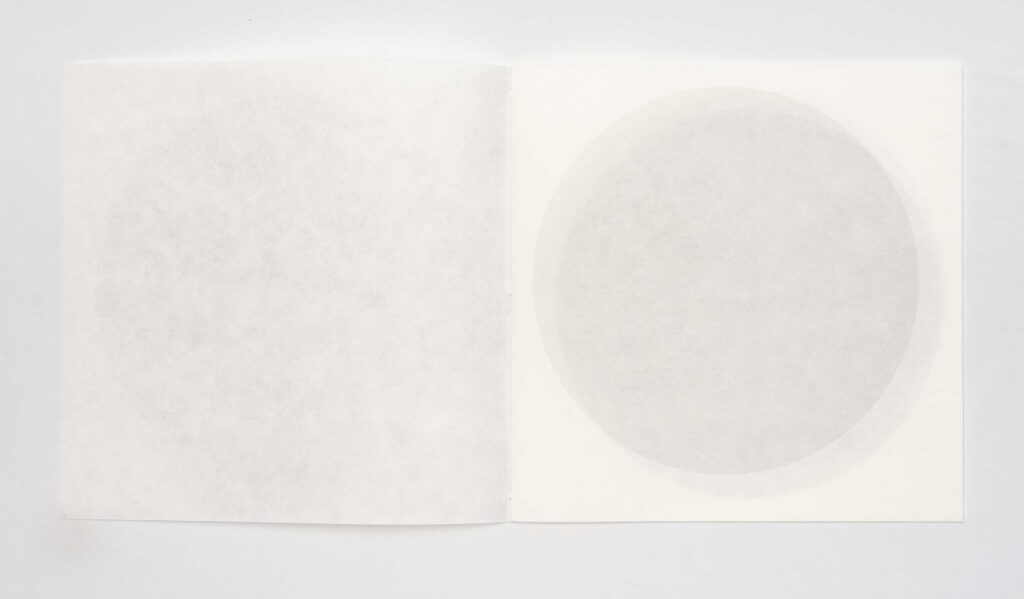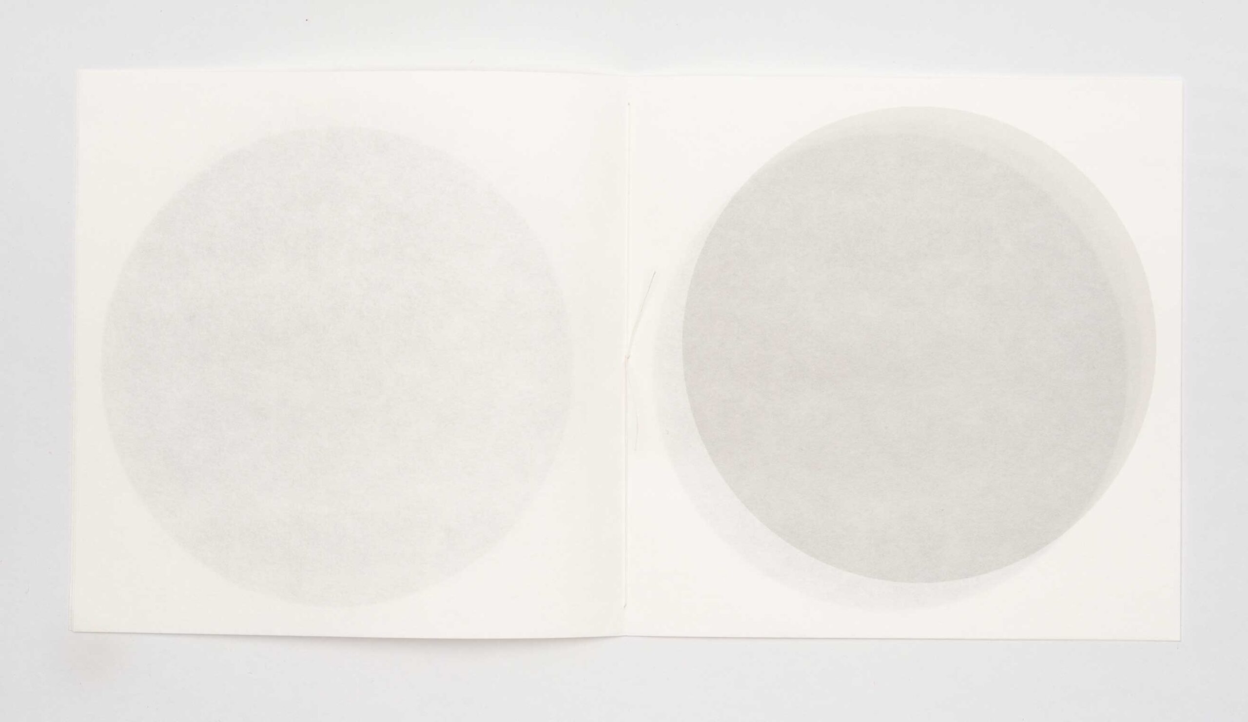 moon jar #2 | Julie Johnstone | book | h200mm x w200cm | printed inkjet on three trimmed sheets of Hahnemühle sumi-e paper 80gsm | 12pp; printed on six facing pages including cover | hand bound with linen thread | the placing of the circle outline shifts throughout the book, by 1cm, and the tint of black increases with each page from 20% on cover to 45% on final page | exploring the transparency effects of the paper, and the nature of apparent irregularity | open edition | 2024 | £15 | purchase
