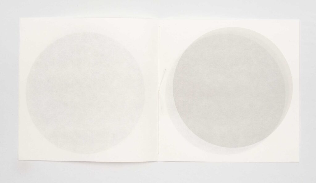 moon jar #3 | Julie Johnstone | book | h200mm x w200cm | printed inkjet on three trimmed sheets of Hahnemühle sumi-e paper 80gsm | 12pp; printed on six facing pages including cover | hand bound with linen thread | the placing of the tinted circle block shifts throughout the book, by 1cm, and the tint of black increases with each page from 15% on cover to 30% on final page | exploring the transparency effects of the paper, and the nature of apparent irregularity | open edition | 2025 | £15 | purchase